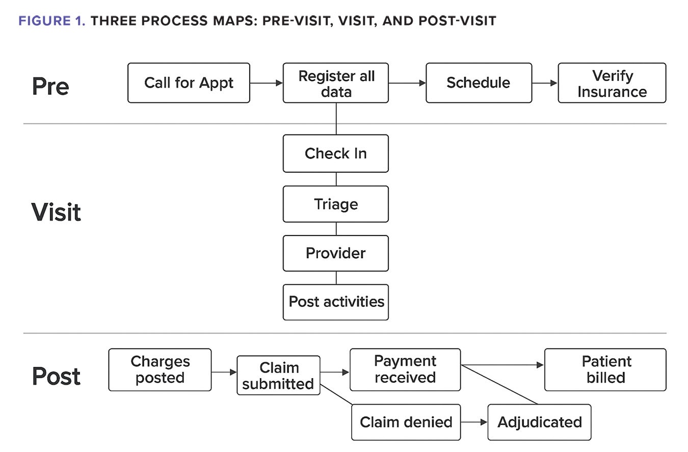 To address this, look at the end-to-end process that delivers a great patient experience. It’s not built by silos; it’s an integrated set of activities. A simple process map begins with the pre-visit activities (e.g., scheduling, eligibility verification), continues through the visit (check-in, triage, clinician interaction, post actions, and checkout), and finishes with post-visit work (care plan compliance monitoring and the revenue cycle). Better yet, think in three stages — pre-visit, visit and post-visit. See Figure 1 for a straightforward process map of each stage. Each stage stands alone, yet each impacts the others.