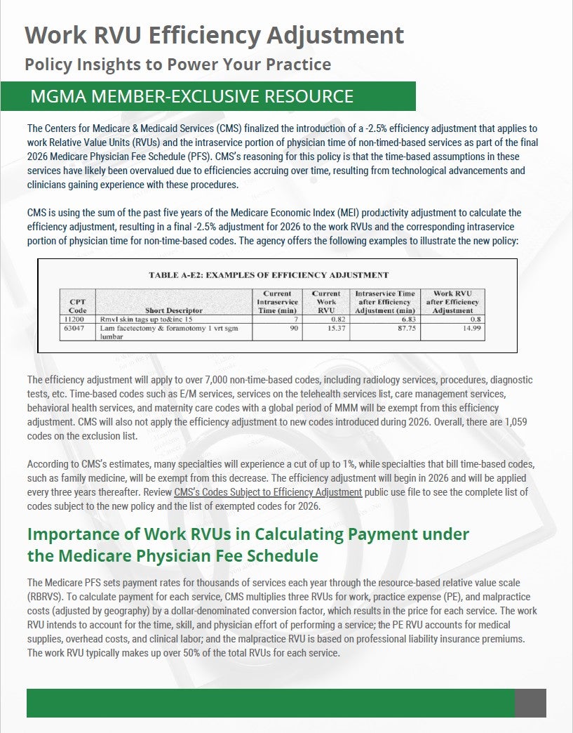 The Centers for Medicare & Medicaid Services (CMS) finalized the introduction of a -2.5% efficiency adjustment that applies to work Relative Value Units (RVUs) and the intraservice portion of physician time of non-timed-based services as part of the final 2026 Medicare Physician Fee Schedule (PFS). CMS’s reasoning for this policy is that the time-based assumptions in these services have likely been overvalued due to efficiencies accruing over time, resulting from technological advancements and clinicians gaining experience with these procedures.