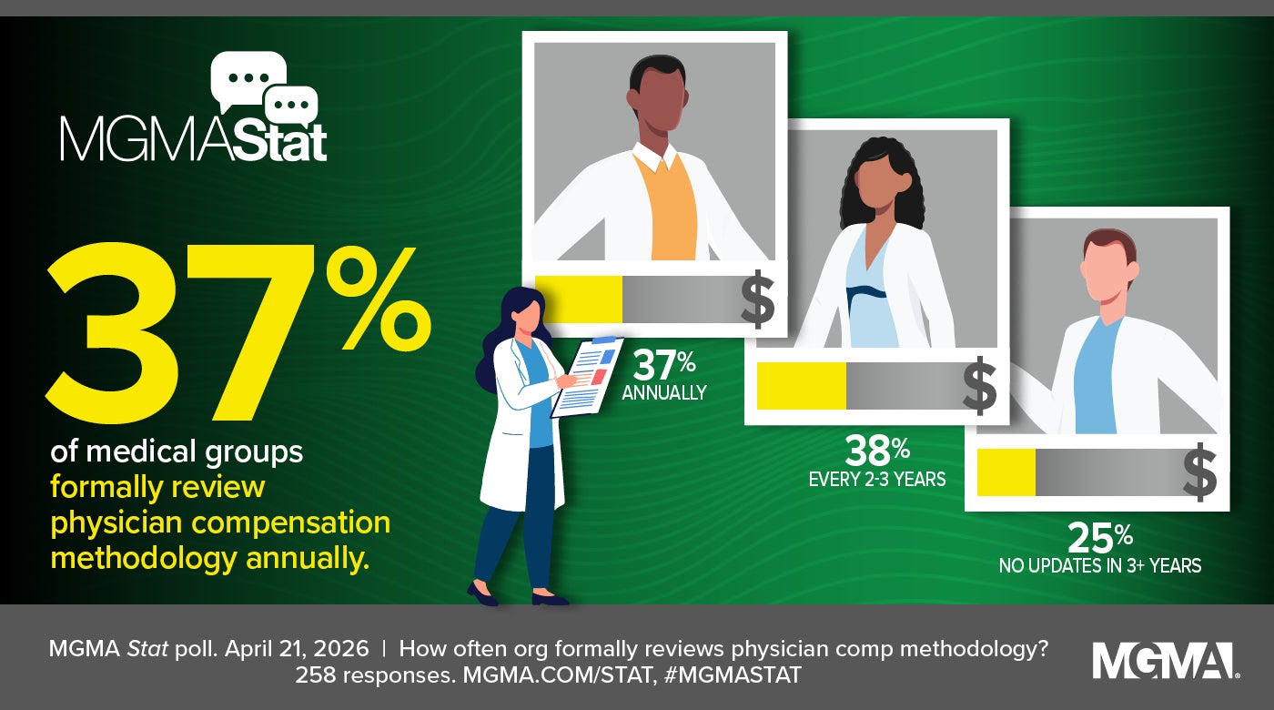 An April 21, 2026, MGMA Stat poll asked medical practice leaders how often their organizations formally review physician compensation methodology. Most groups (75%) do these reviews either annually (37%) or every two to three years (38%), while about one in four (25%) report they’ve had no update in three or more years. The poll had 258 applicable responses.